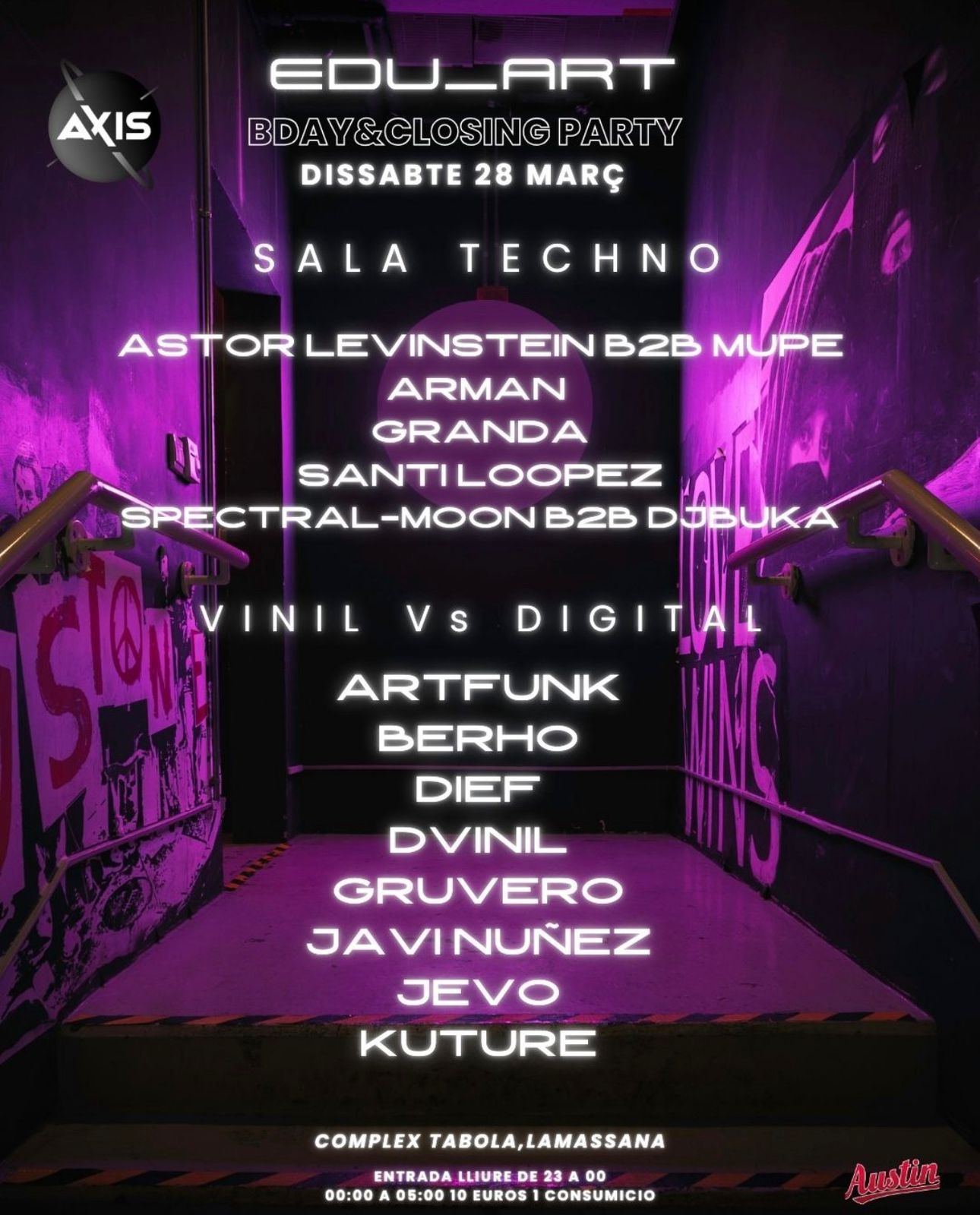 El dissabte 28 de març el Complex Tà bola de la Massana encén els altaveus per a una festa irrepetible. Una última nit per celebrar l’aniversari d’EDU_ART amb dues atmosferes electròniques: la Sala Techno, amb sets potents i B2B explosius, i l’espai Vinil vs Digital, on els DJs faran vibrar la pista amb una batalla d’estils i formats.